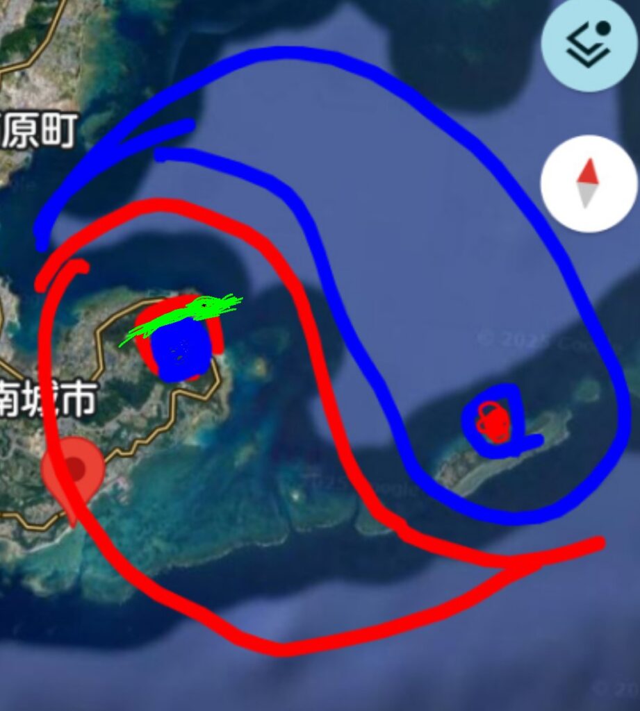 久高島(下図の青の中にある赤の部分)にある、陰の中にある陽はどこかという質問をいただいた。