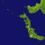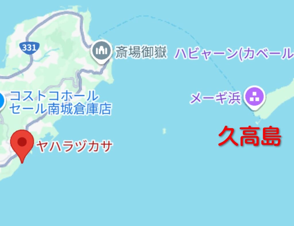 斎場御嶽、久高島がありその間の海岸線に沿ってヤハラヅカサがある。