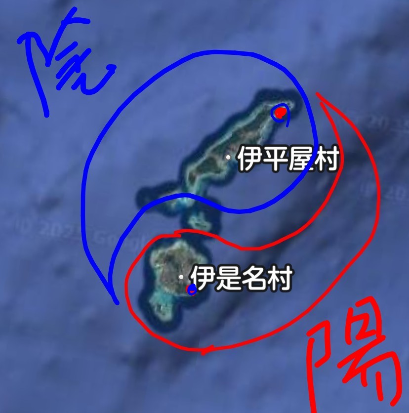 そして、沖縄にはもう1つ同じように陰陽☯マークになっている場所があるという。それが、伊是名島、伊平屋島だ。伊是名島自体は陽で伊是名城趾、伊是名玉御殿の辺りが陽の中にある陰の場所。伊平屋島自体は陰で天の岩戸伝説のあるくま屋の洞窟が陰の中にある陽(アマテラスは太陽神)の場所ということになる。